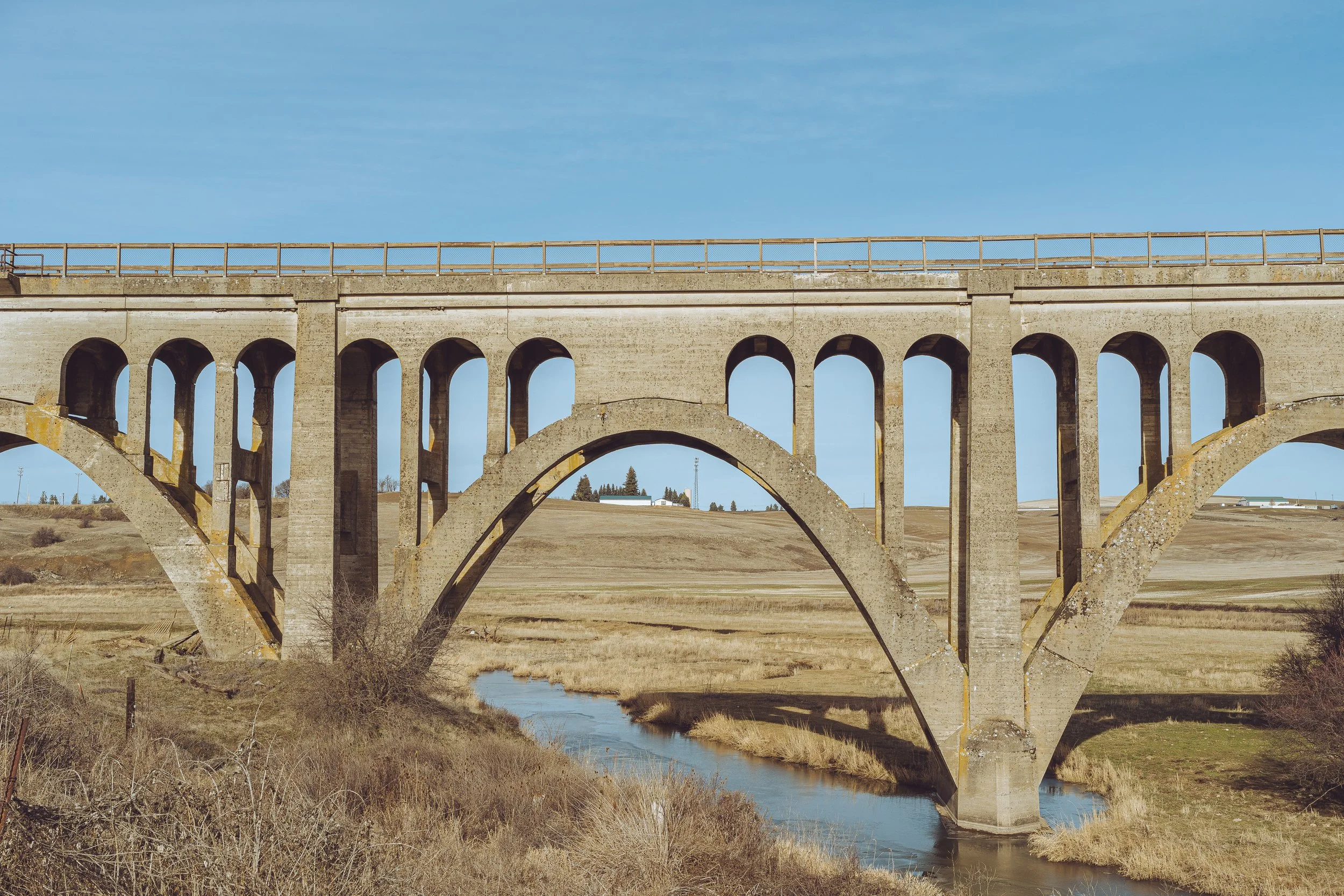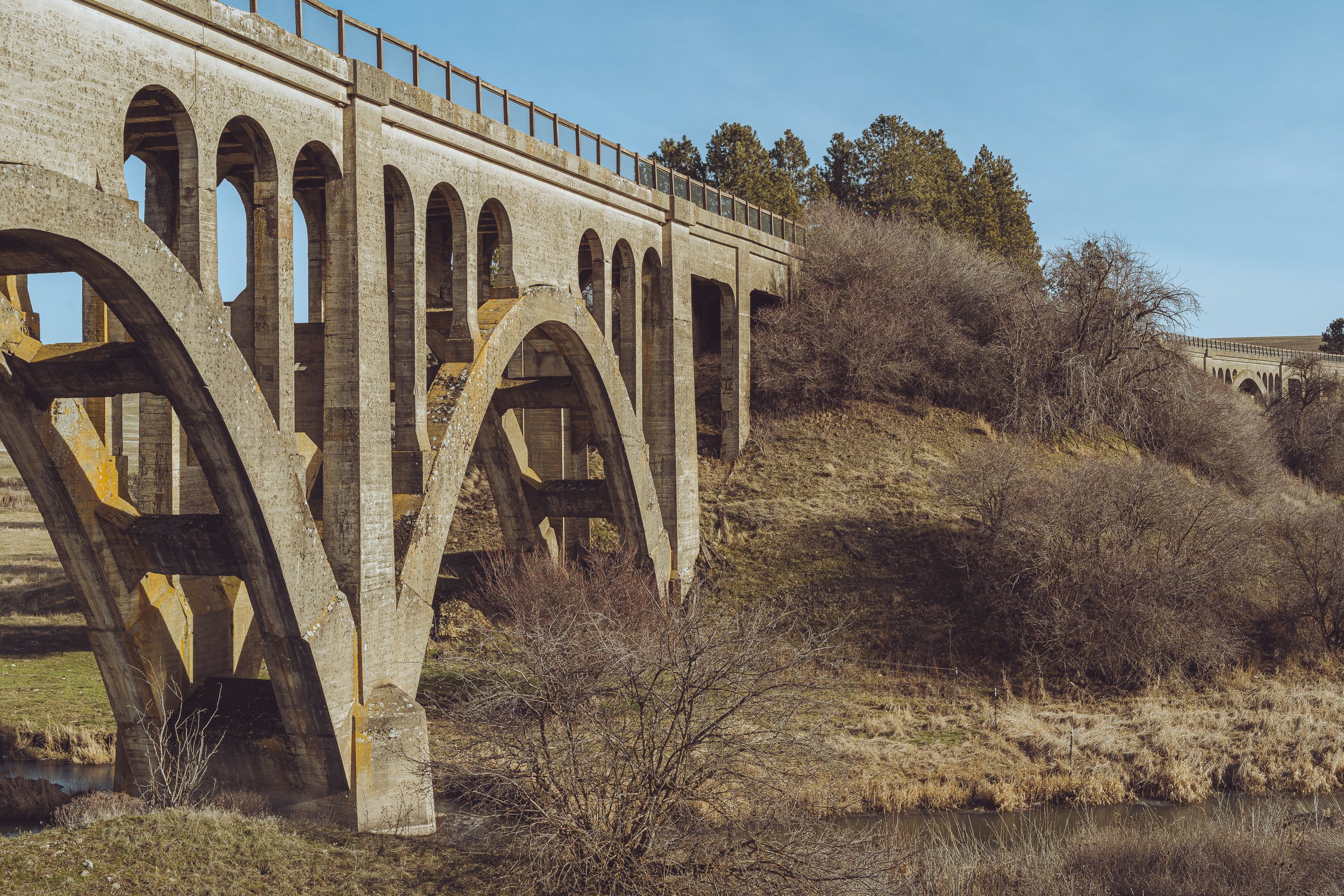 Built in 1915, the Rosalia Railroad Bridge wasn’t just designed for transport—it was designed to make a statement. At the time, the Milwaukee Road was locked in a fierce competition with the Northern Pacific Railroad. To flex their engineering muscles, they bypassed the standard steel and timber designs of the era in favor of these massive, reinforced concrete arches.